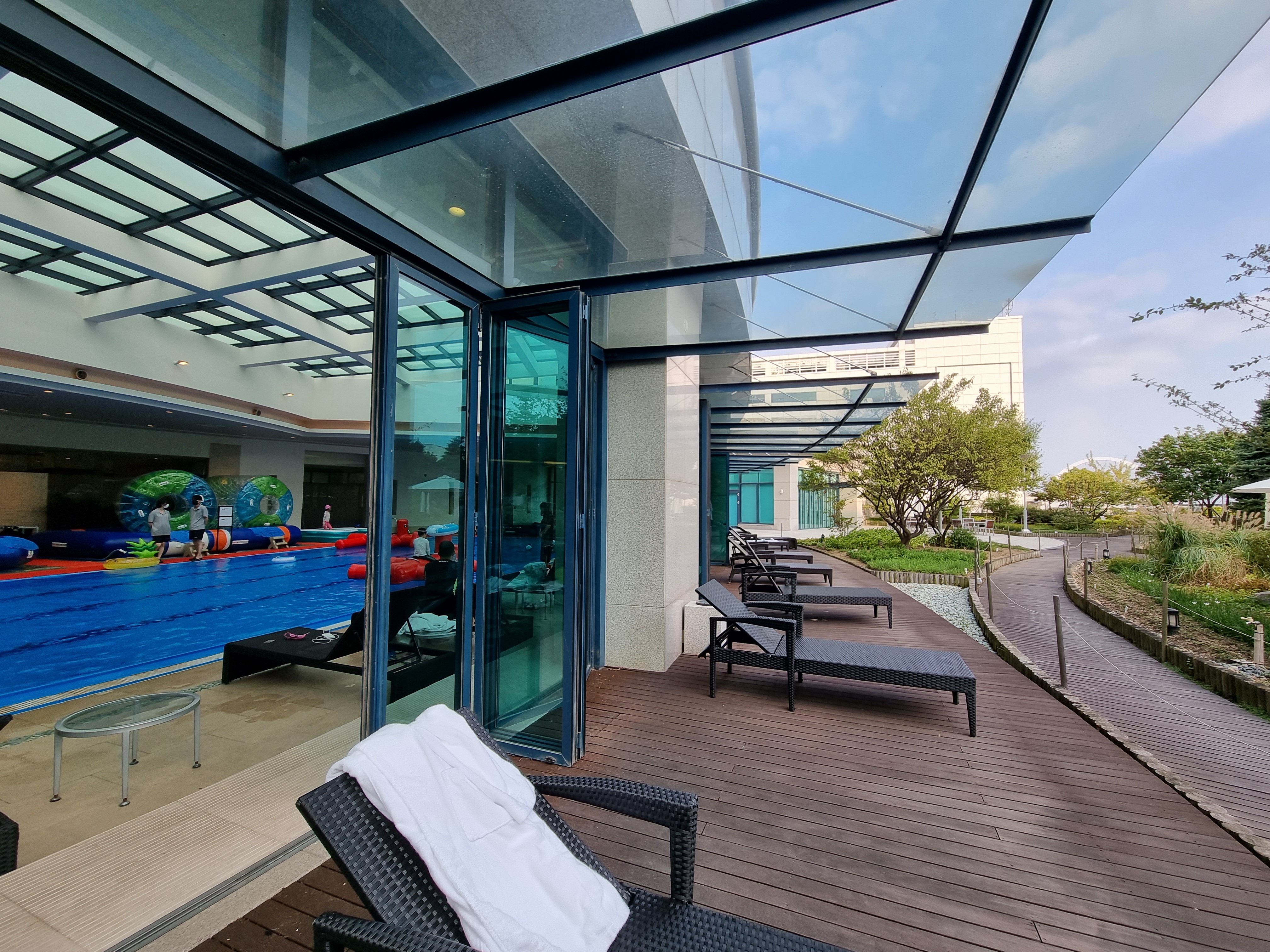 수영장이 실내지만 한쪽에 통 유리 문들이 있어 답답하지는 않았습니다.